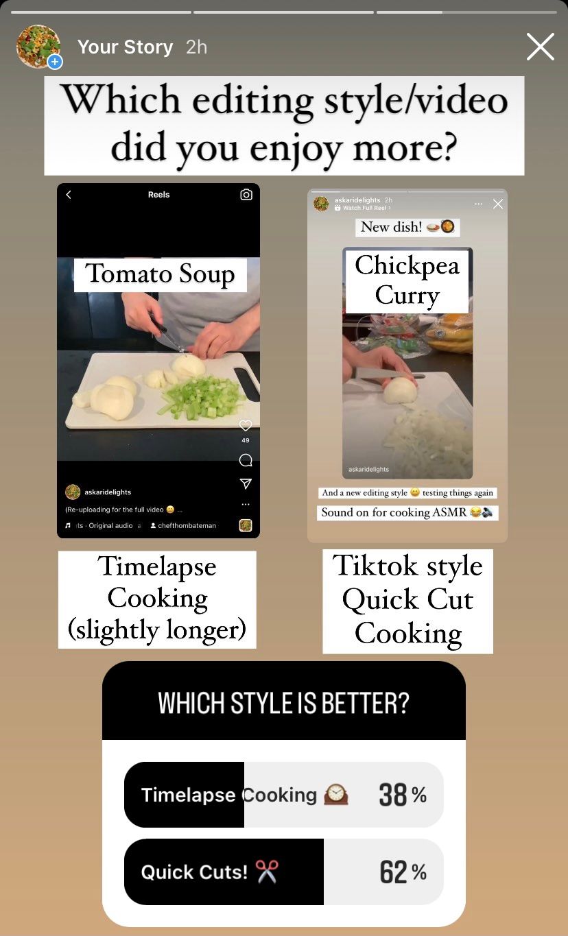 For example, while editing my cooking videos, I tested out two different methods - unsure about which would do better, or which people preferred.