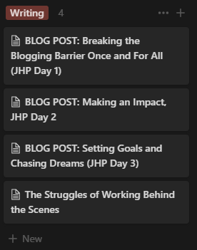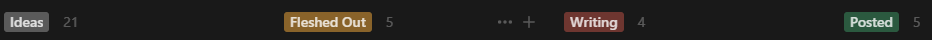When I first started blogging, I planned this 'Blog Workflow' page on my Notion account, where I organised each of my posts, their progress status and content. Adapting the idea from somewhere online, I spent a decent amount of time making sure I’d included all the relevant fields, the statuses, the workflow process through which I’d be going through - and finished it, satisfied that now I had a system to run through, which made things a lot easier.