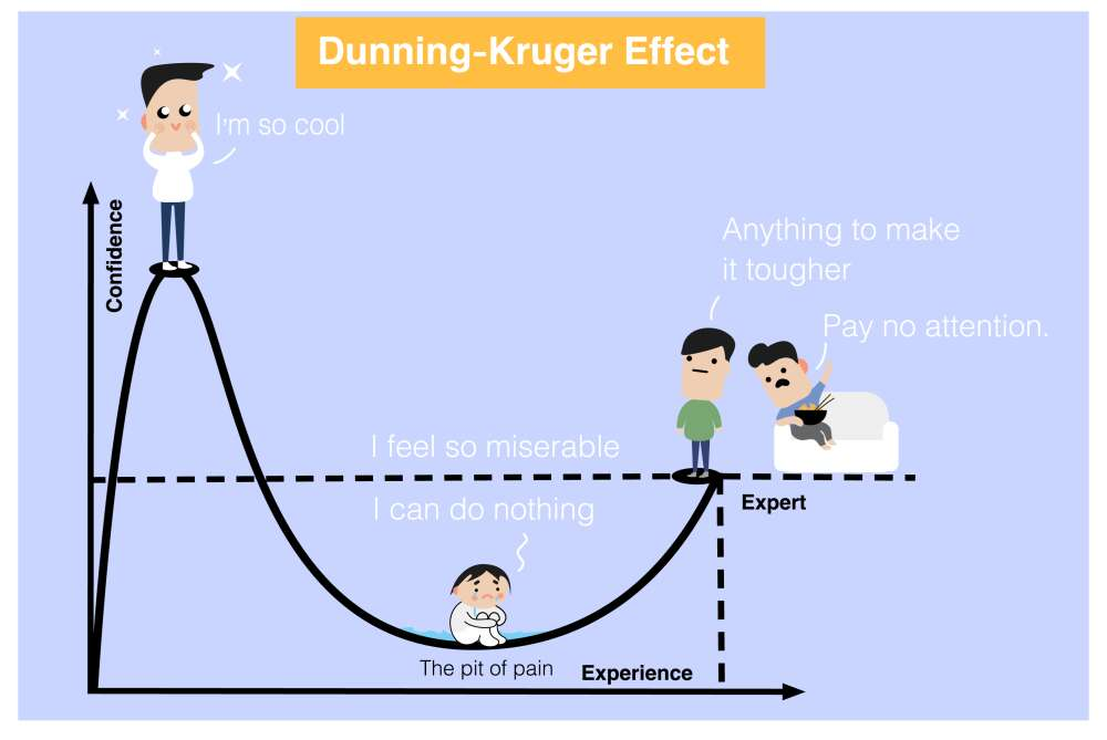 Following the graph, novices experience overconfidence due to quick progression on the learning curve - while experts’ confidence drops because they realize what they don’t yet know. Paradoxically, the more you become an expert, the more you may feel like an imposter.